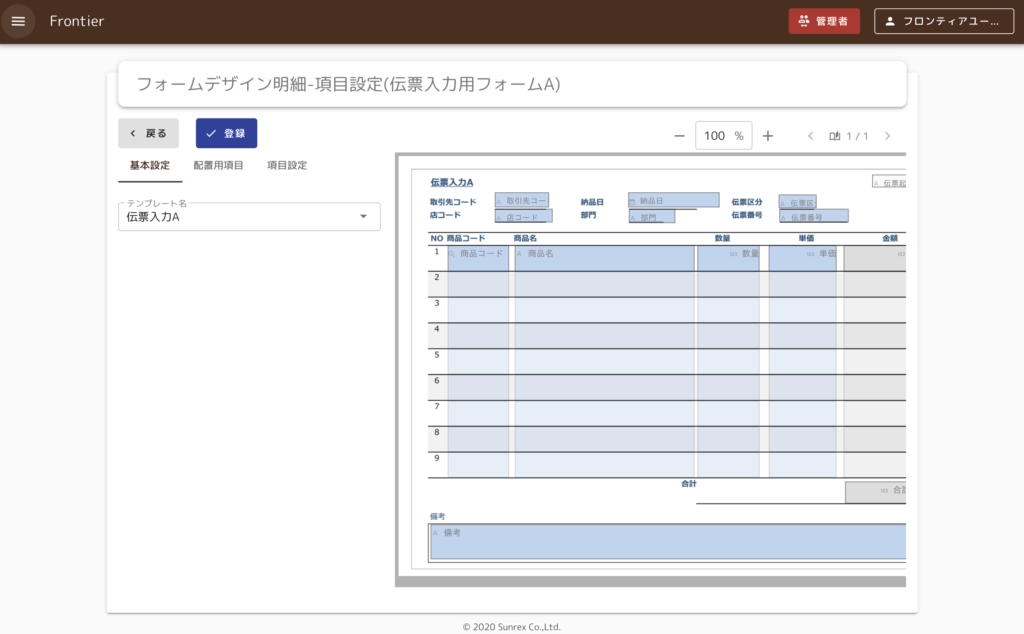 管理者機能フォームデザイン及びレポートデザイン機能にて、背景として使用するテンプレートファイル(PDF)を登録します。